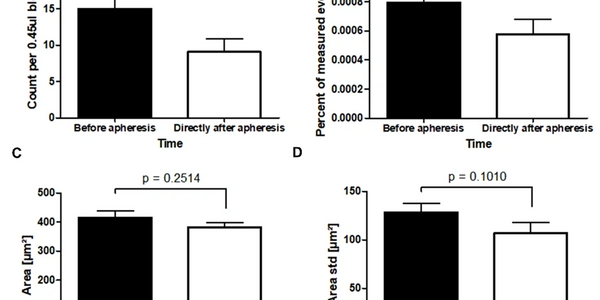 Analysis of microclot-like structures from RT-DC measurements of 0.45 µl of whole blood. A-D. Bar plots of n = 16 patients (repeat samples were not received for three patients). A. Count of microclot-like structures per 0.45 µl of blood. B. Microclot-like structures expressed as a percentage of all measured events (blood cells and cell agglomerates). C. Projected area (µm²) of microclot-like structures. D. Standard deviation of the projected area (µm²) of microclot-like structures. (Source: State of the Art H.E.L.P. Apheresis: Advances in Management of COVID-19, Long COVID, and Post-COVID-19 Vaccination Syndrome)